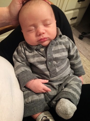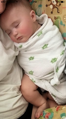 Sleep: he started sleeping through the night at 9 weeks but still has yet to do it consistently. It's usually 4 days on then 1 or 2 days off. He goes down at 7 & wakes at 5:30 with my alarm. If he wakes in the night it's usually at 3:00 - 3:30. Steve and I take turns getting up but I seem to get more turns. That's OK. I love the extra snuggles. He won't be this little forever. We throw around the idea of sleep training but it's just not the right thing for our family at this time. We enjoy the rocking and the cuddles and the love. Maybe in the future. Who knows. Kyle slept in about every place you could imagine for the first 9 weeks of his life then pretty consistently in his RNP until at around 4 1/2 months he decided he was done with it. Then we moved his crib into our room and that is where he sleeps. Again, we toss around the idea of moving him into his room but it's not right for our family just yet. But he still loves his weekend snuggle naps. So do I.